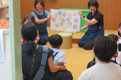 お楽しみ抽選会の前に、大型絵本「ぜったいにおしちゃだめ?」やパネルシアター「おおきなだいこん」の読み聞かせをしました。