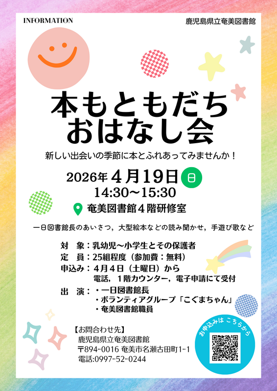 「本もともだちおはなし会」 4月19日(日)に,「本もともだちおはなし会」を行います。 一日図書館長やボランティアグループ「こぐまちゃん」,県立奄美図書館職員による読み聞かせなどを予定しています。 現在、参加申込み受付中です。 出会いの季節です。本との出会いの機会にしてみませんか? みなさまの来館をお待ちしています! 「本もともだちおはなし会」申込みはこちらをクリック