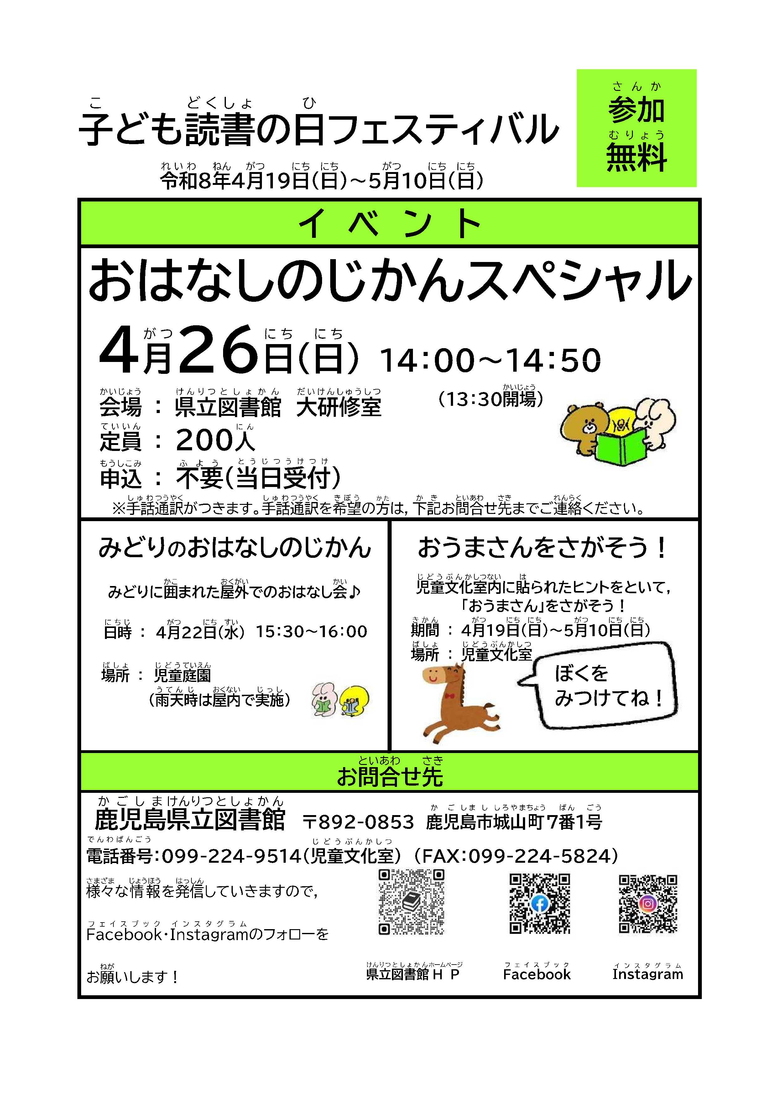 また,4月20日(日)の「おはなしのじかんスペシャル」は,当日の受付のみで,どなたでもご参加いただけます。