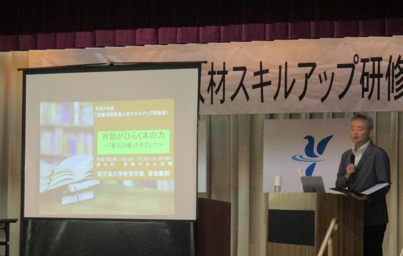 全体会では,まず,鹿児島大学教育学部の 原田 義則 准教授に「対話がひらく本の力~『第三の場』をめざして~」と題して御講演いただきました。