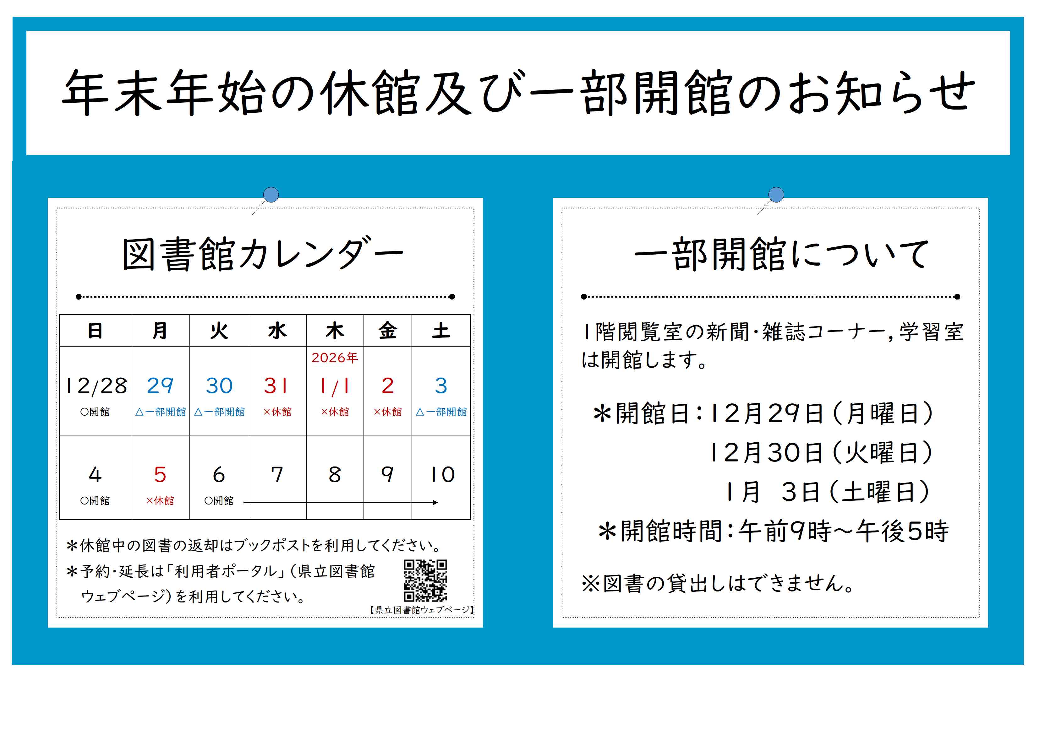ただし,12月29日(月曜日),12月30日(火曜日),1月3日(土曜日)は1階閲覧室の新聞・雑誌コーナー及び学習室のみ開館します。